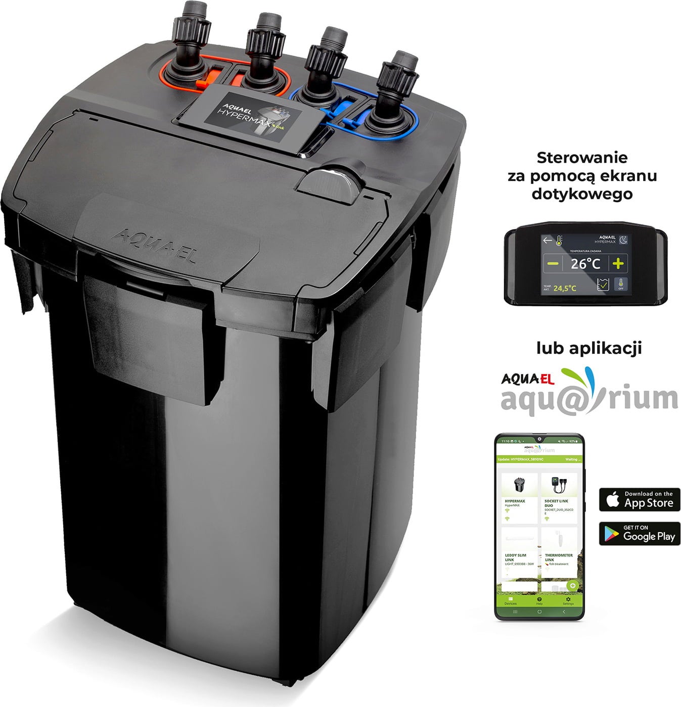 Aquael Hypermax Link oferuje imponującą pojemność filtra wynoszącą 15,9 litra i jest niezwykle energooszczędny dzięki elektronicznie sterowanej pompie. 2 węże dopływowe i 2 węże wylotowe zapewniają dobrą cyrkulację wody i skutecznie zapobiegają tworzeniu się martwych stref w akwariach od 200 do 1500 litrów. Dwie grzałki o mocy 150 W każda i sterowanie za pomocą aplikacji nie pozostawiają nic do życzenia!