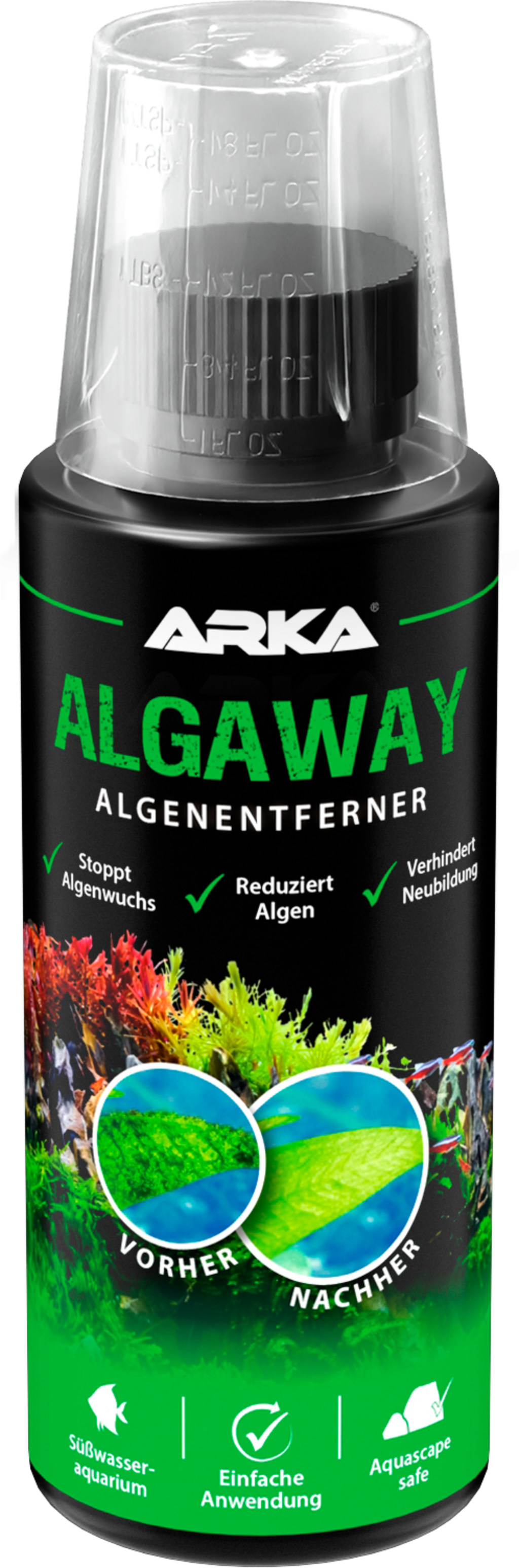 Algaway firmy ARKA to specjalnie opracowany środek do usuwania glonów do stosowania w każdym akwarium słodkowodnym. Zatrzymuje wzrost istniejących glonów, usuwając składniki odżywcze, których glony potrzebują do rozwoju, co zatrzymuje ich rozprzestrzenianie się na dłuższy czas.