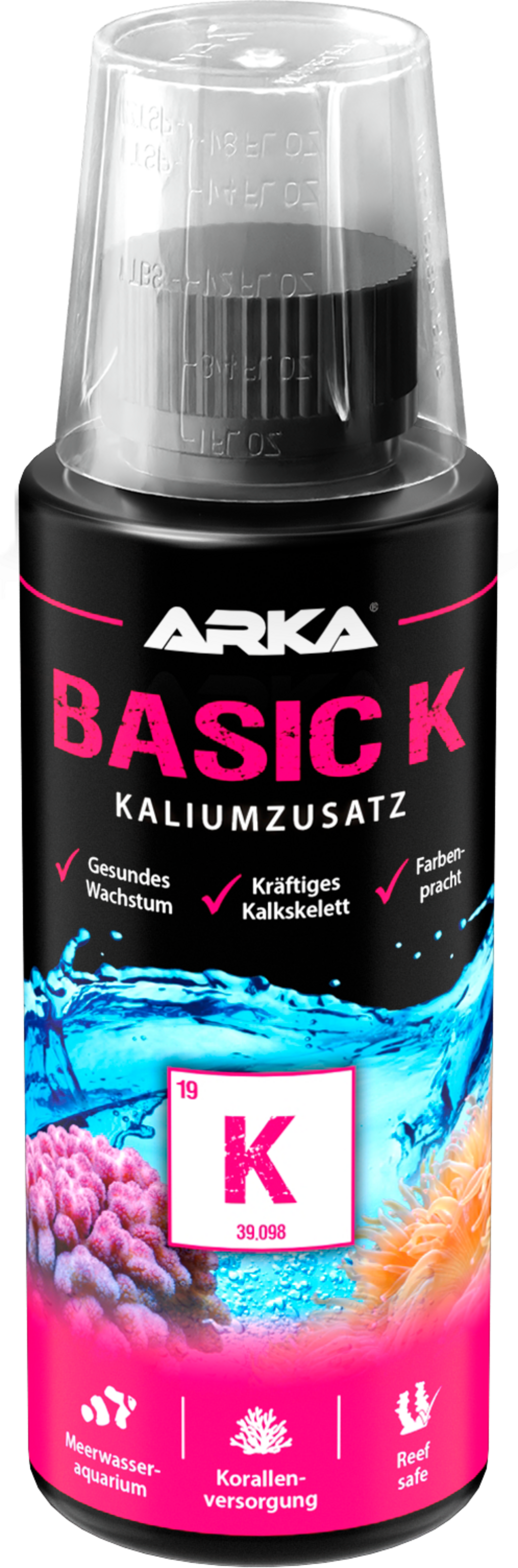 Suplement potasu Basic K firmy ARKA jest odpowiedni dla wszystkich akwariów morskich, w których w szczególności zwiększa poziom potasu i zapobiega jego niedoborom.