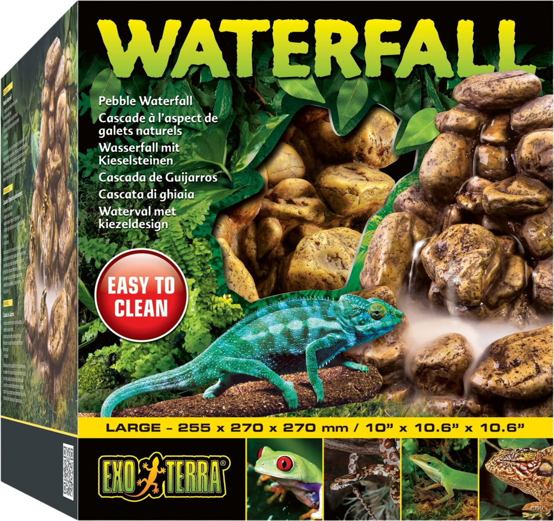 Dekoracja ta stymuluje naturalne zachowania związane z piciem jaszczurek, kameleonów, jaszczurek Anolis, agam itp. Pielęgnacja jest łatwa, ponieważ wodospad można łatwo zdemontować. Obieg wody zapewnia pompa Exo Terra Repti Flo.
