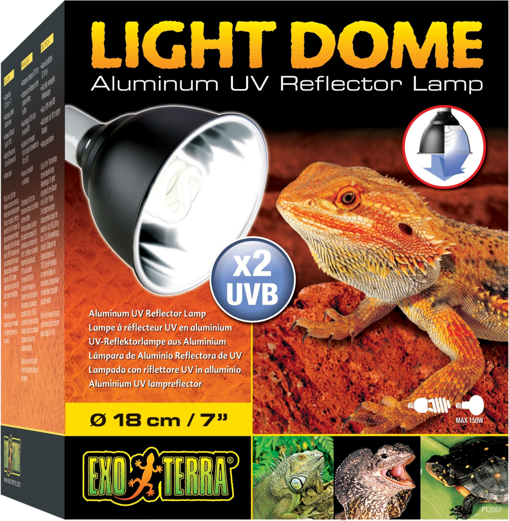 Kompaktowa lampa reflektorowa UV Exo Terra Light Dome jest idealna do stosowania w terrariach Exo Terra. Podczas gdy powierzchnia aluminiowej lampy reflektorowej świeci w eleganckiej, jedwabiście matowej czerni, wnętrze jest wysoce odblaskowe i emituje do 100% promieni UVA i UVB. Reflektor UV nadaje się zarówno do świetlówek, jak i żarówek. W połączeniu z żarówkami Exo Terra (maks. 75 W, 150 W) i lampami terrarystycznymi (maks. 26 W), możesz wydobyć to, co najlepsze ze swojego terrarium!