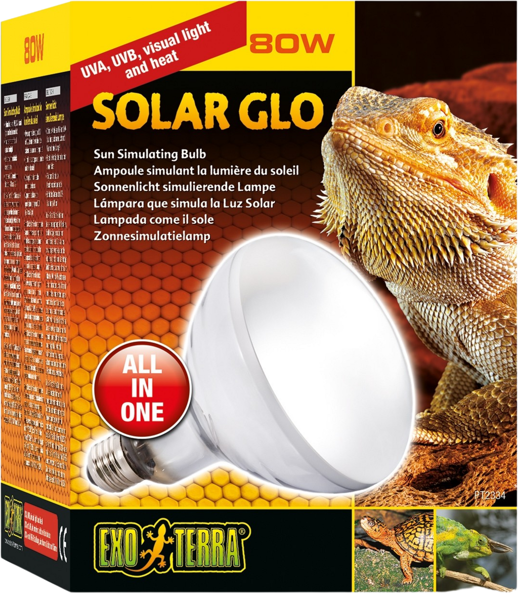 Exo Terra Solar Glo 80 W to lampa rtęciowa o pełnym spektrum, która zastępuje naturalne światło słoneczne w terrarium. Lampa jest optymalnie dostosowana do wymagań świetlnych i cieplnych zwierząt terrariowych i zapewnia im światło ultrafioletowe (UVA, UVB), widzialne i podczerwone.