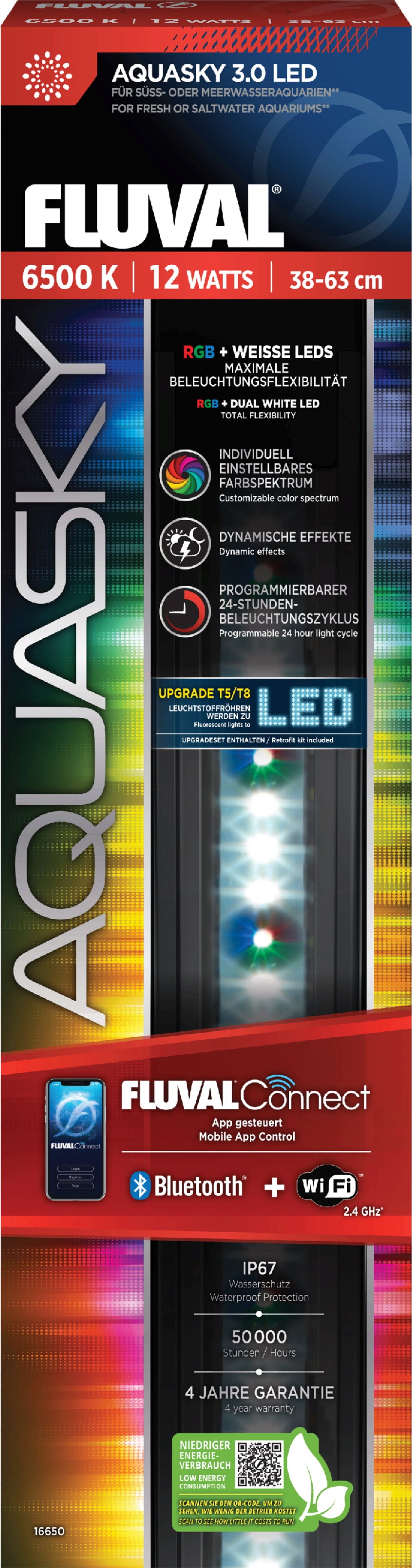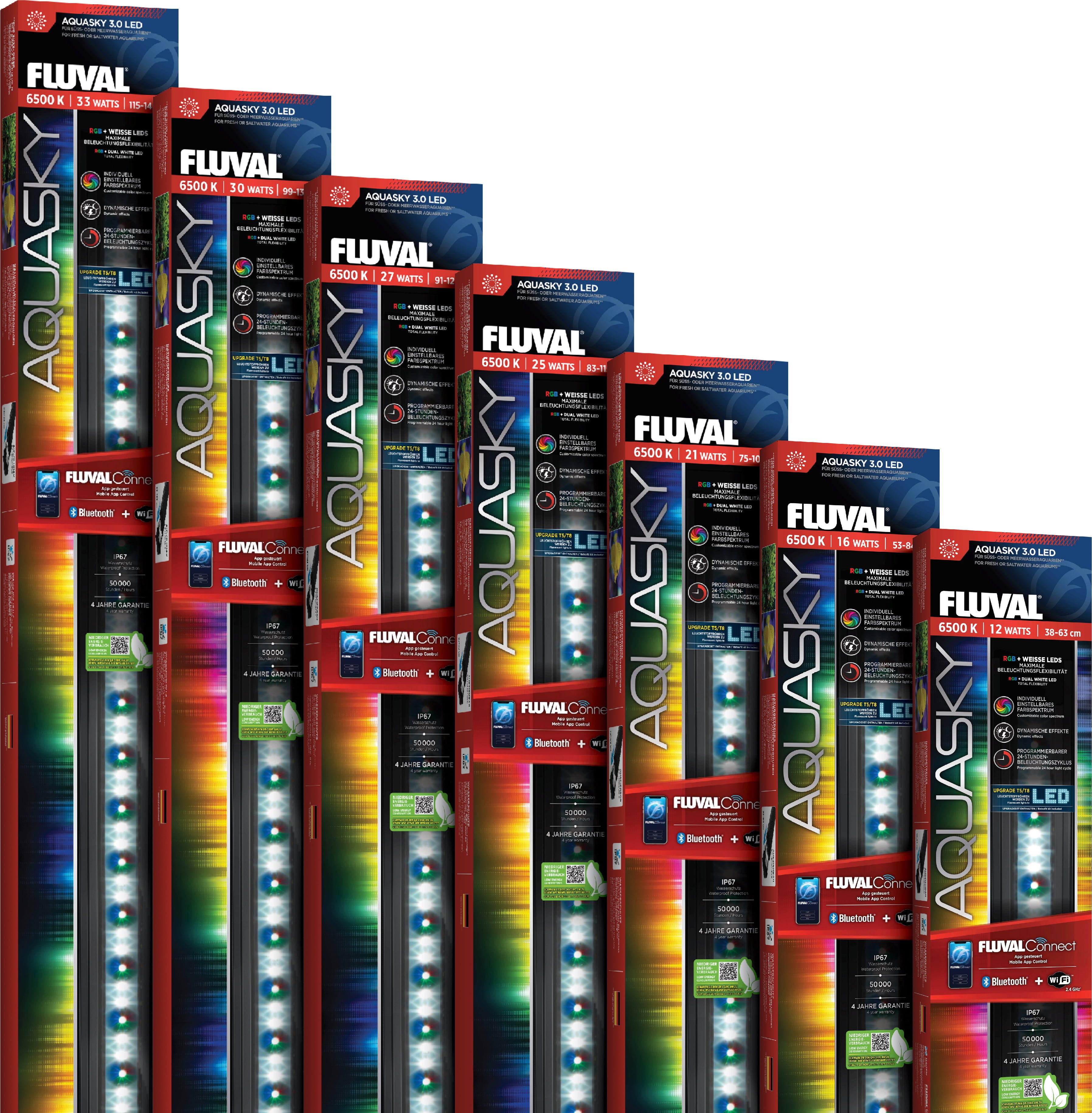 Dzięki Fluval AquaSky LED 3.0 można zmienić swoje akwarium w dynamiczne widowisko świetlne, którym steruje się wygodnie za pomocą smartfona! Dzięki aplikacji FluvalConnect oraz nowemu połączeniu WiFi i Bluetooth, spektrum kolorów składające się z diod RGB i wyjątkowo dużej liczby białych diod LED można dostosować całkowicie do własnych upodobań.