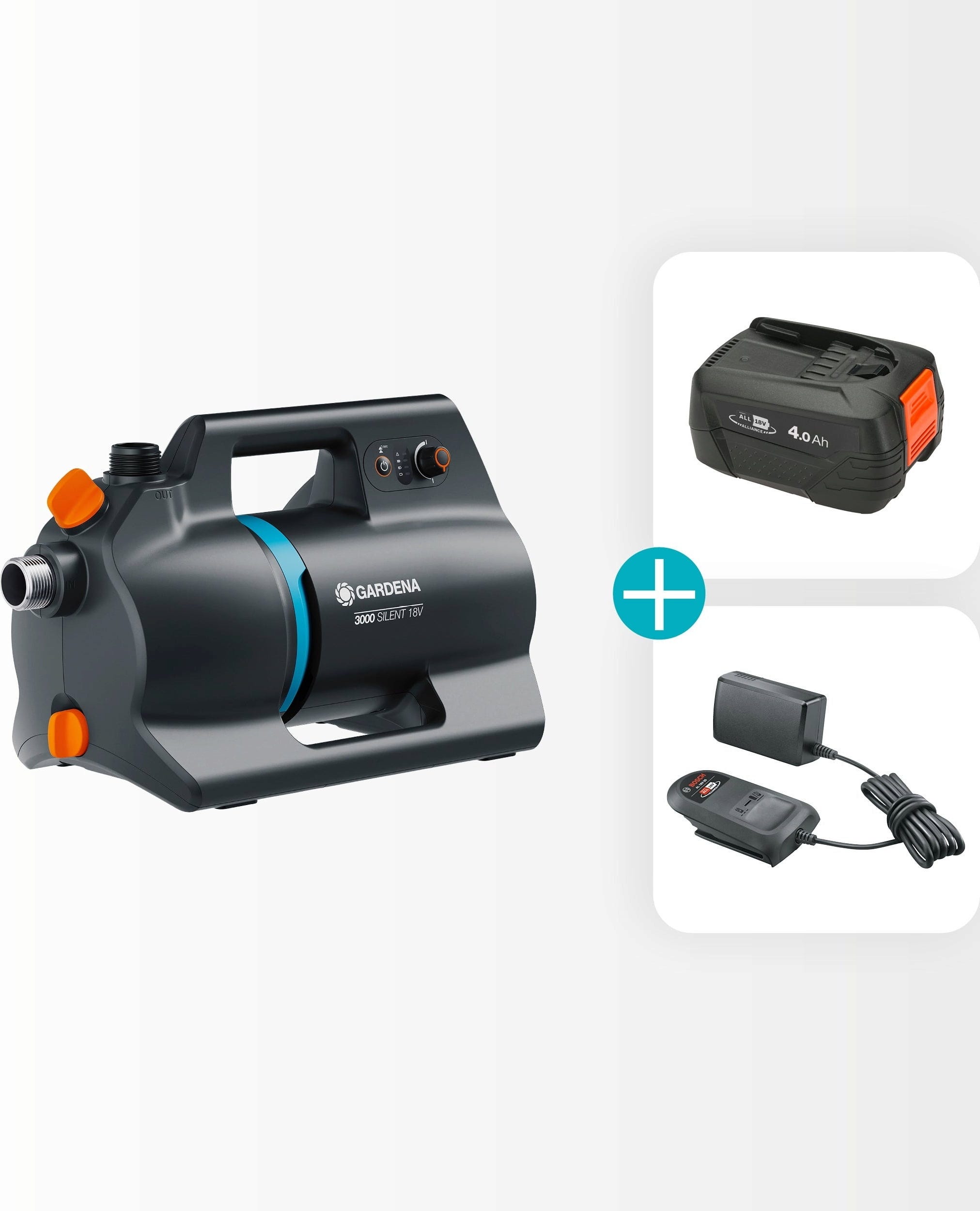 1 x akumulatorowa pompa ogrodowa 3000 Silent 18 V P4A, 1 x akumulator 4 Ah, ładowarka