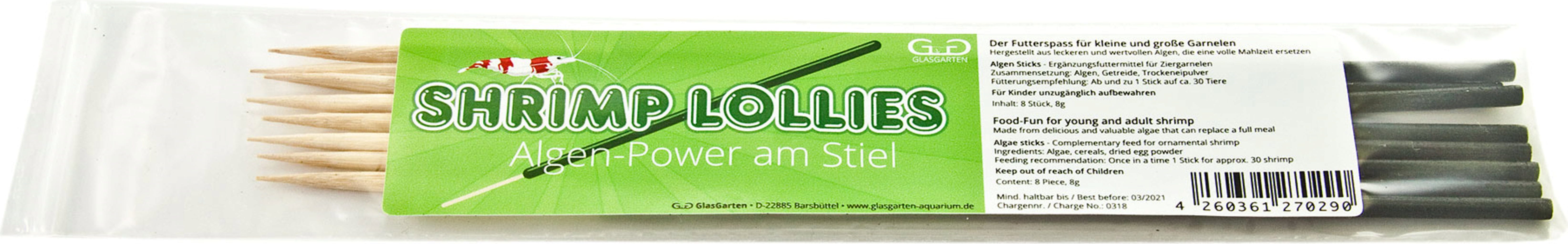 Shrimp Lollies są pokryte dobrym pokarmem adhezyjnym dla krewetek i raków karłowatych, który można doskonale skubać. Wystarczy wbić lizak w podłoże akwarium, a krewetki lub raki wkrótce będą na nim siedzieć i jeść. W krótkim czasie cały pałąk z pokarmem jest pełen krewetek - świetne rozwiązanie, jeśli chcesz np. zrobić zdjęcie lub mieć przegląd populacji krewetek.