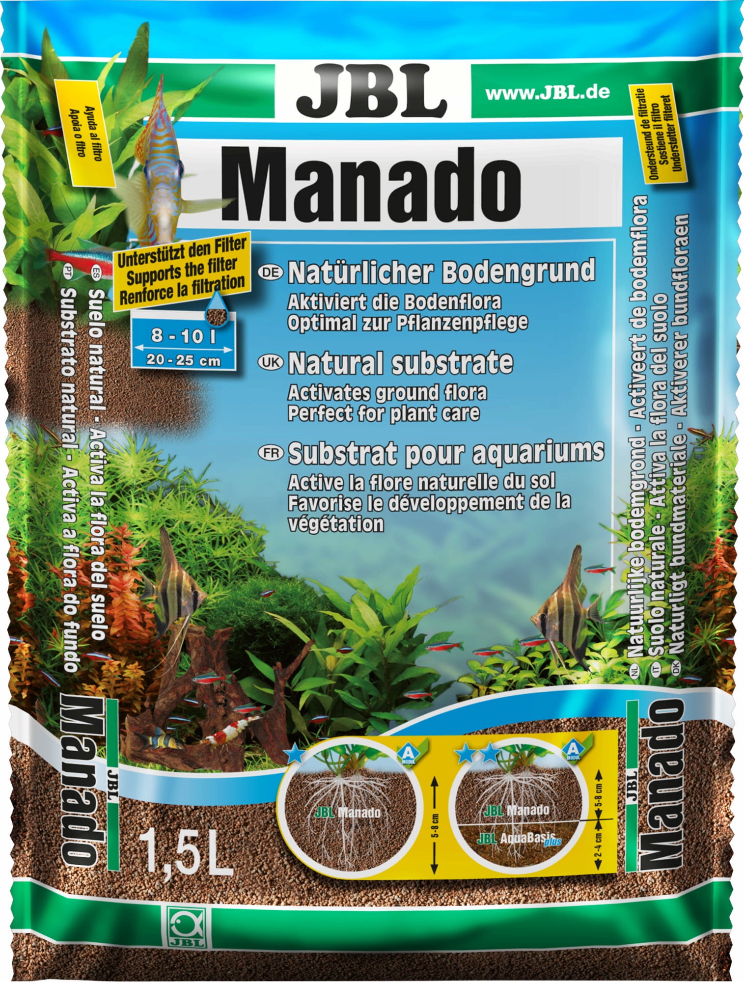 To naturalne podłoże do akwariów słodkowodnych jest idealne do pielęgnacji roślin ze względu na swoją porowatą strukturę i funkcję magazynowania składników odżywczych. Umożliwia wzrost roślin i działa przeciw glonom: pożyteczne i skuteczne bakterie czyszczące kolonizują podłoże i zapewniają optymalny wzrost korzeni roślin poprzez naturalną strukturę porów. Filtr jest w ten sposób odciążony i zapewnia krystalicznie czystą wodę. JBL Manado jest idealny do pielęgnacji ryb i bezkręgowców, ponieważ do wody nie przedostają się żadne niepożądane zanieczyszczenia. Zaokrąglone granulki chronią wrażliwe gatunki ryb przydennych np. Corydoras i inne. Naturalne podłoże pochłania nadmiar składników odżywczych i w razie potrzeby uwalnia je ponownie.