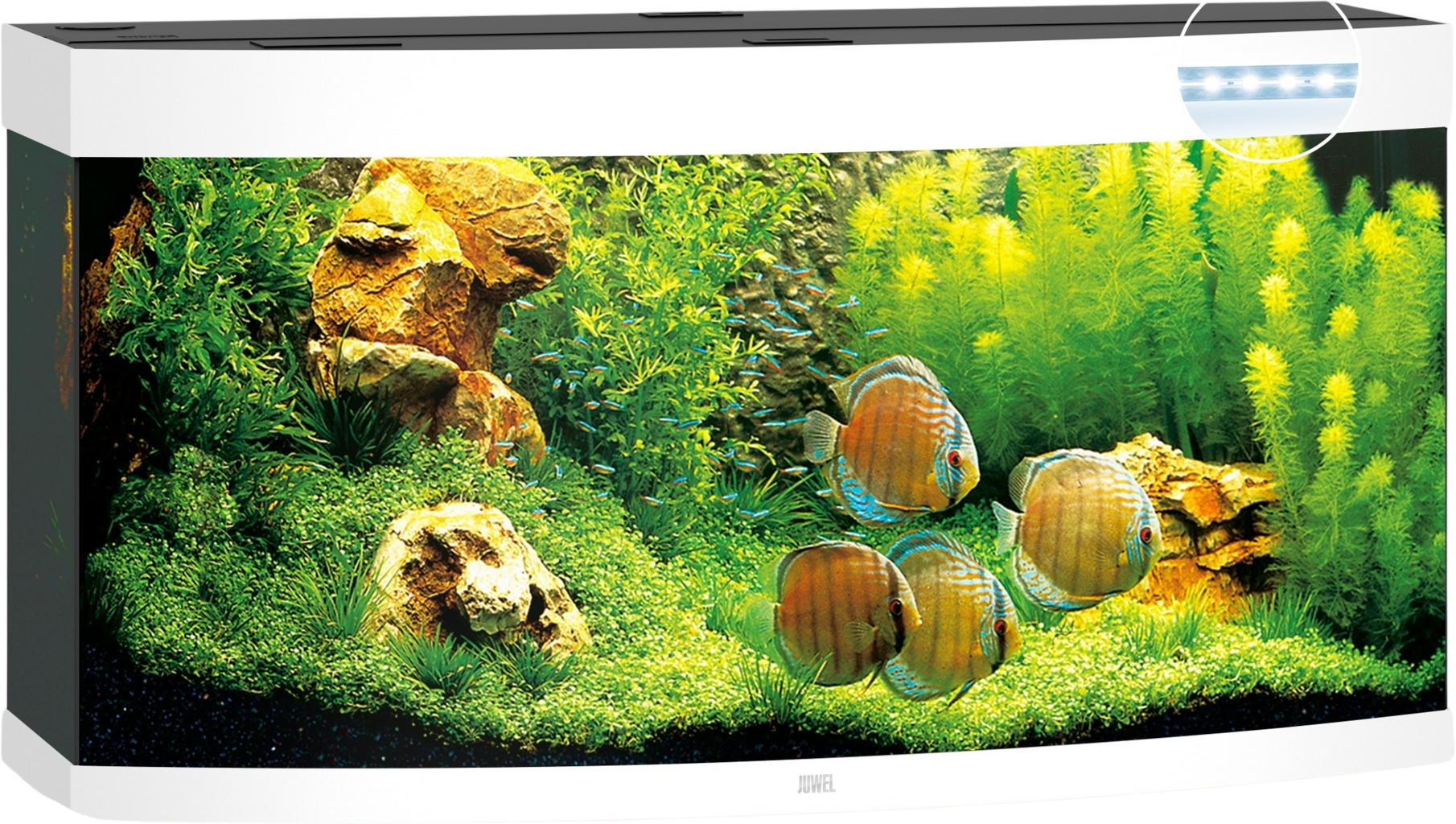 Nowoczesna technologia świetlówek MultiLux LED firmy JUWEL zapewnia doskonałe oświetlenie i doskonały wzrost roślin. Wymienne 21-watowe świetlówki LED DAY i NATURE generują optymalne spektrum światła, jednocześnie oszczędzając do 50% energii w porównaniu do świetlówek T5. System oświetlenia MultiLux LED w VISION 450 LED pozwala na komfortową pracę w akwarium nawet przy włączonym oświetleniu. Zgrzewana ultradźwiękowo jednostka oświetleniowa jest w 100% wodoodporna i spełnia wysokie europejskie standardy bezpieczeństwa.