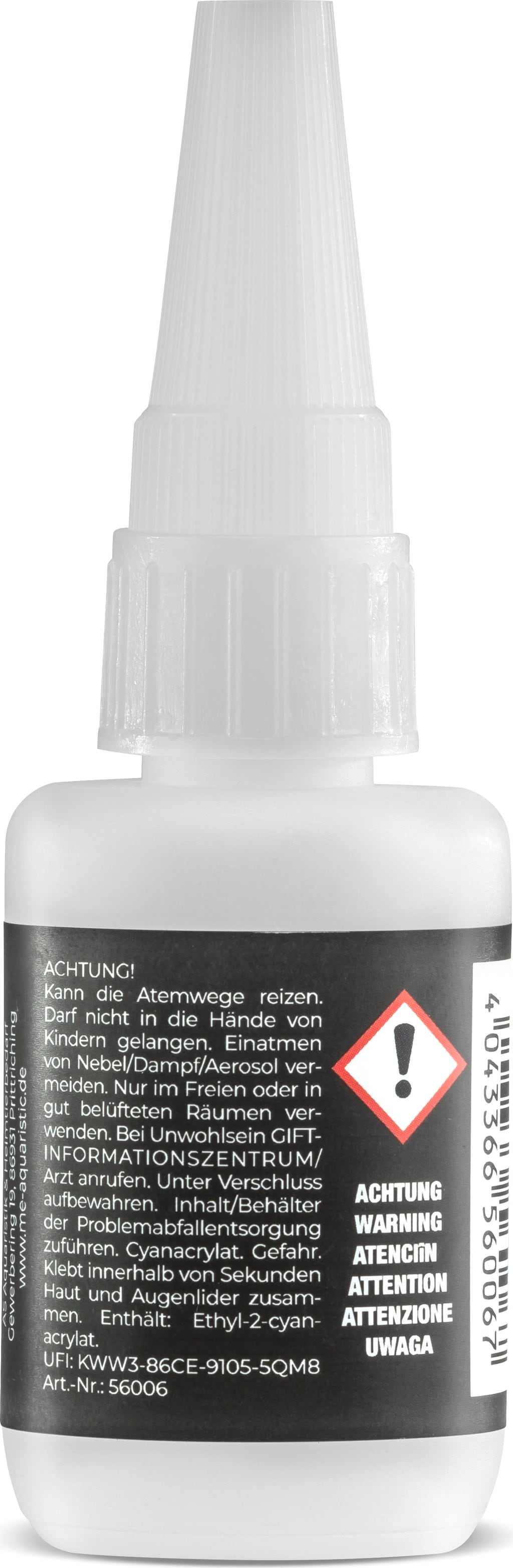 - EUH 202 - Cyjanoakrylany. Niebezpieczeństwo. Skleja skórę i powieki w ciągu kilku sekund. Chronić przed dziećmi.
