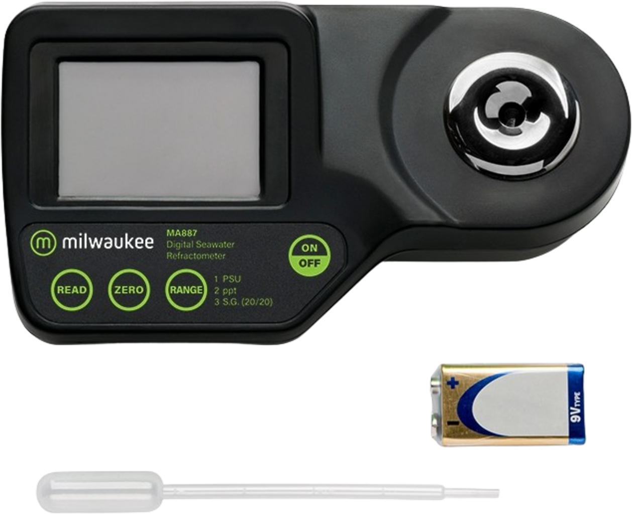 Refraktometr zasolenia MA887 firmy Milwaukee przenosi analizę jakości wody na wyższy poziom! Podczas gdy wiele urządzeń wymaga wizualnego odczytu zmierzonych wartości, refraktometr pokazuje wiarygodne wyniki na przyjaznym dla użytkownika cyfrowym wyświetlaczu LCD w mniej niż 2 sekundy - z dokładnością ± 2 ppt i automatyczną kompensacją temperatury (ATC), która przeciwdziała niepożądanemu wpływowi temperatury na zmierzoną wartość. Wyświetlacz LCD wyłącza się automatycznie po trzech minutach nieużywania, aby zapewnić dłuższą żywotność baterii. W zestawie znajduje się bateria 9 V AA.