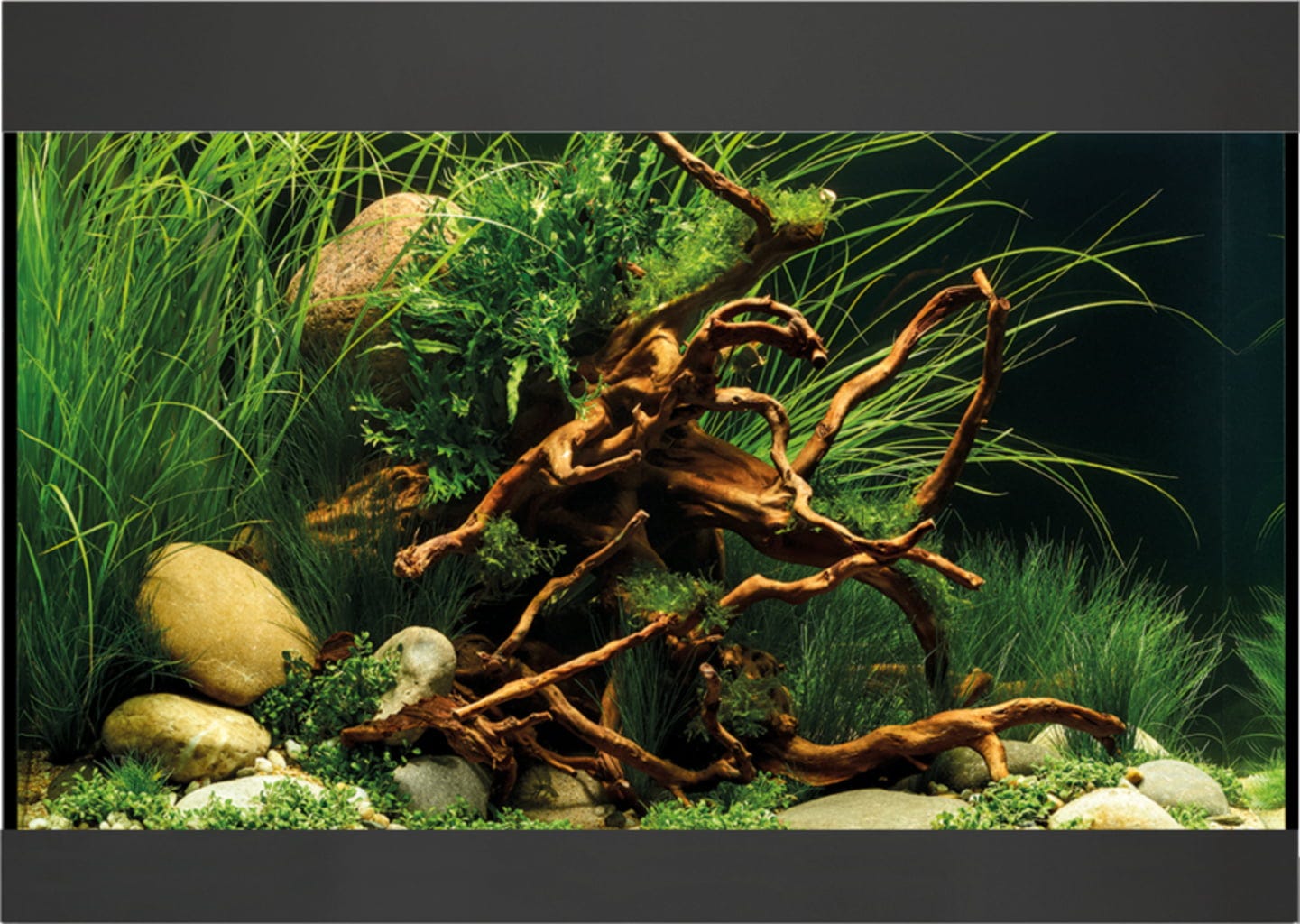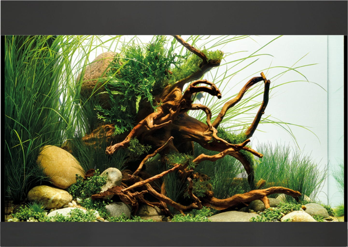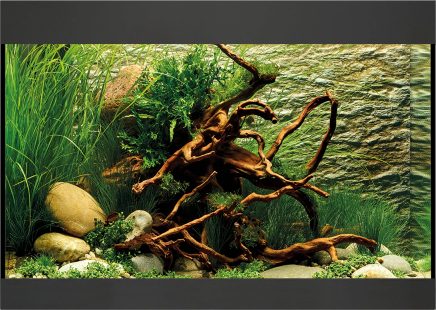 - Osłona krawędzi wody oraz maskownica żwiru są foliowane i w stylowy sposób obramowują mieszkańców akwarium oraz rośliny