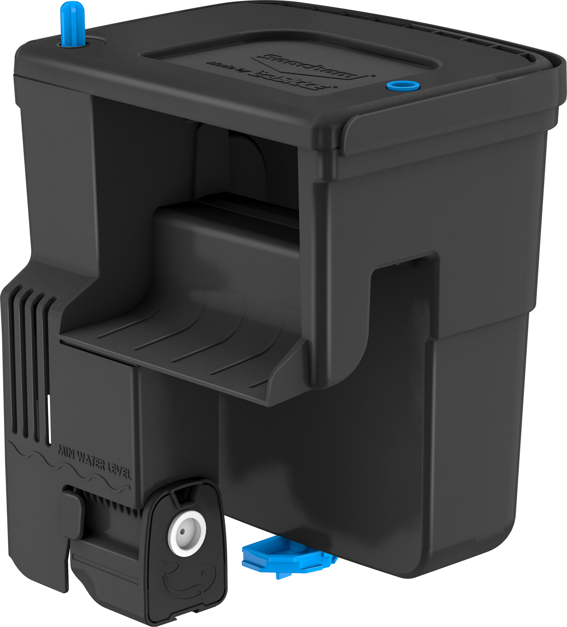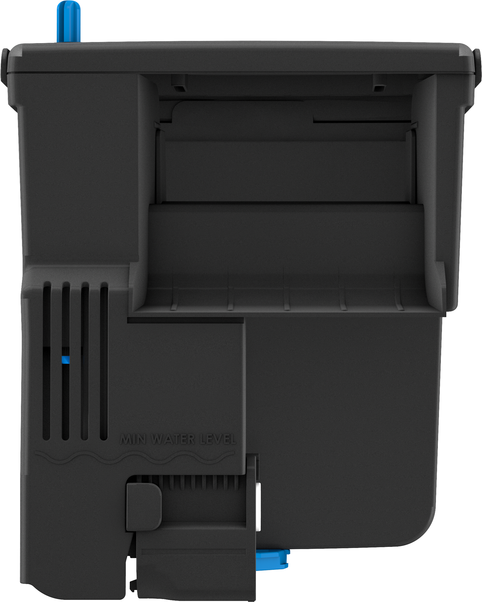 Uwaga dotycząca konserwacji: Po pewnym czasie na mediach filtracyjnych mogą tworzyć się osady, które ograniczają lub blokują przepływ wody. W takim przypadku woda jest kierowana z powrotem do akwarium przez boczny wylot wokół filtra. Przekierowana w ten sposób woda podnosi niebieski wskaźnik konserwacji i sygnalizuje, że nadszedł czas na wyczyszczenie filtra.
