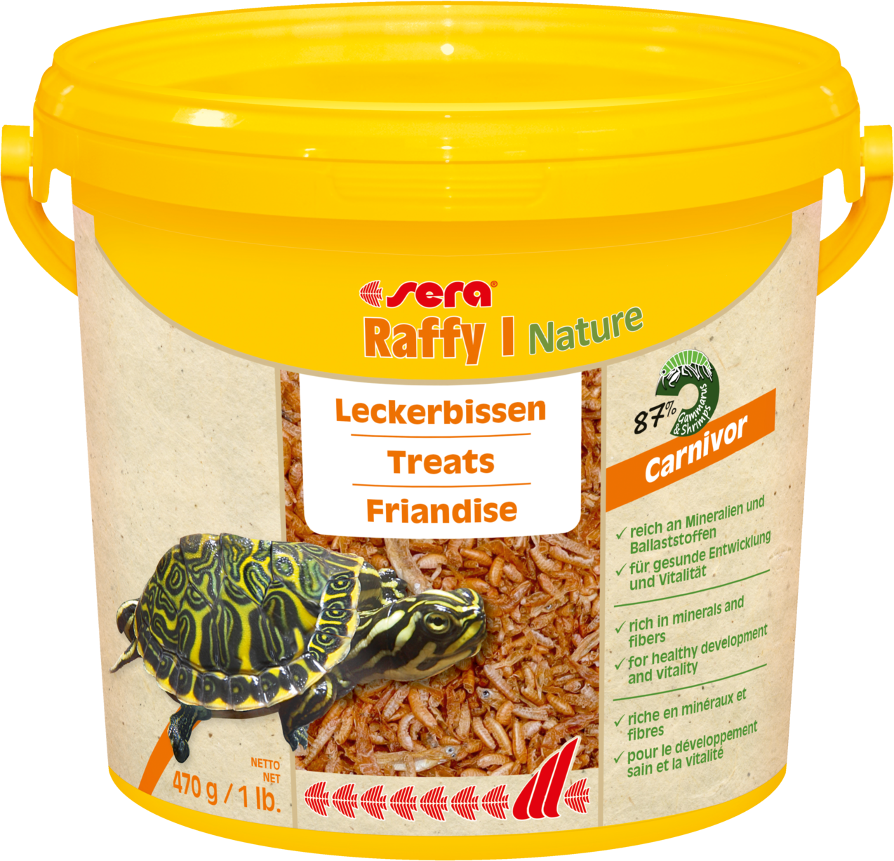 sera Raffy I Nature to przysmak, który nie zawiera barwników ani konserwantów i został stworzony z naturalnych, delikatnie suszonego kiełża (87 %), małych rybek i kryla dla żółwi i innych (okazjonalnie) mięsożernych mniejszych gadów i płazów.