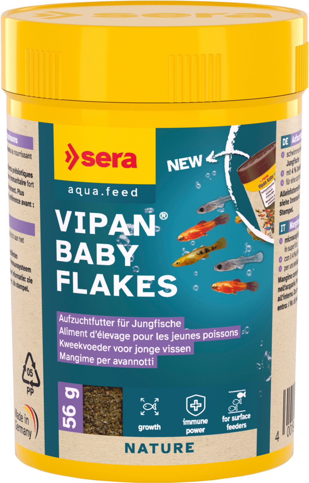 sera Vipan Baby Flakes to pokarm w formie mikropłatków przeznaczony do odchowu młodych ryb żerujących przy powierzchni wody w akwarium słodkowodnym.
