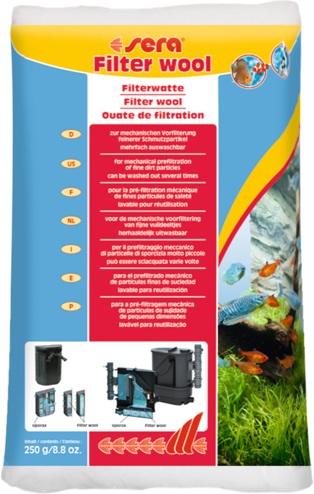 Wata filtracyjna sera do mechanicznej filtracji wstępnej składa się ze stabilnych włókien. Zatrzymuje drobniejsze cząsteczki brudu przez dłuższy czas, nie przywierając ani nie zapadając się. Można ją kilkakrotnie prać.