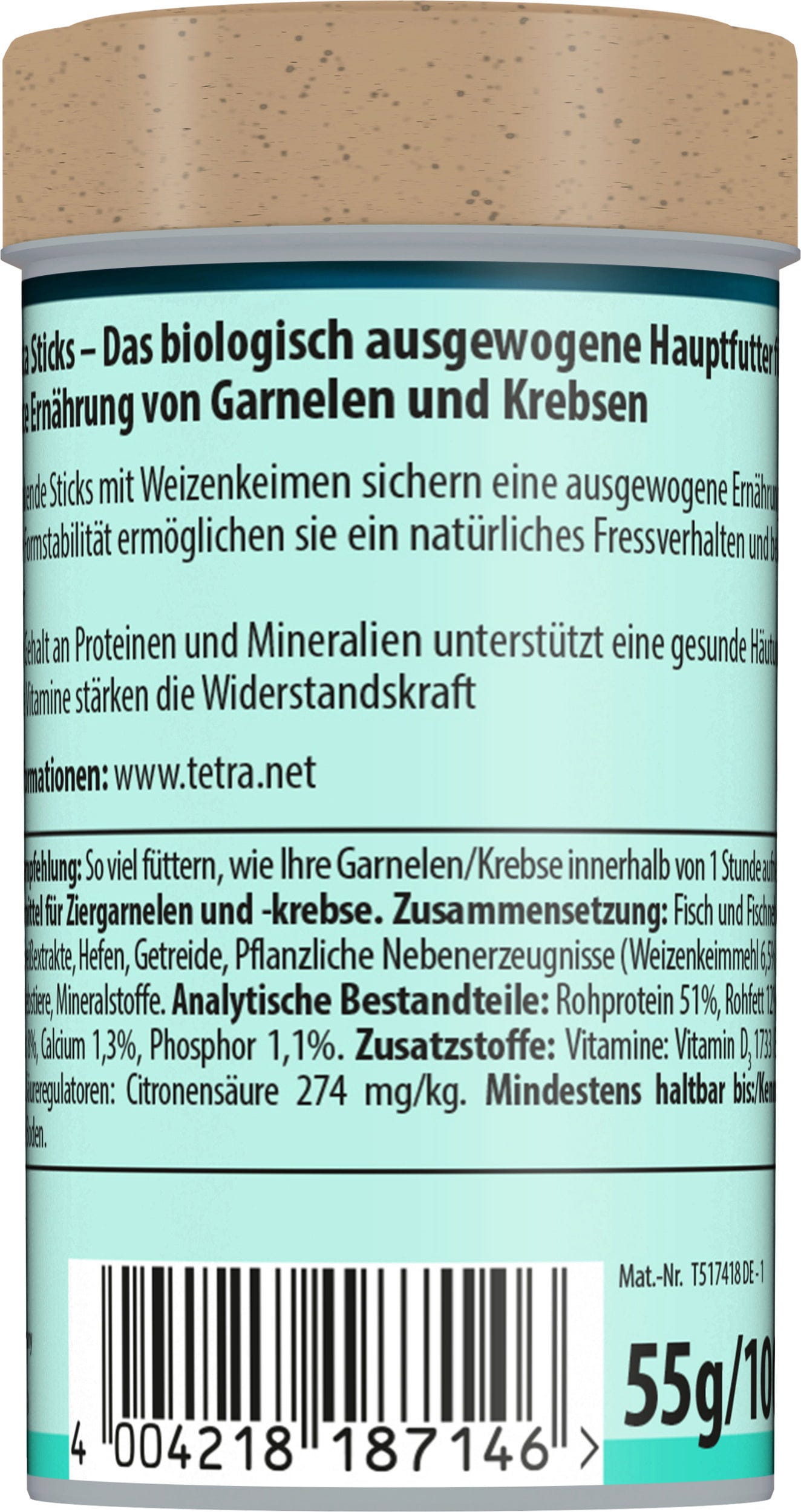 Tetra Crusta Sticks to szybko tonące pałeczki, które zostały wzbogacone bardzo dużą zawartością kiełków pszenicy zapewniając zbilansowaną dietę dla raków i krewetek. Dzięki stabilnej formie umożliwiają naturalne odżywianie i nie zanieczyszczają wody. Optymalna zawartość białka i minerałów zapewnia zdrową dietę. Odporność wzmacniają składniki roślinne i niezbędne witaminy.