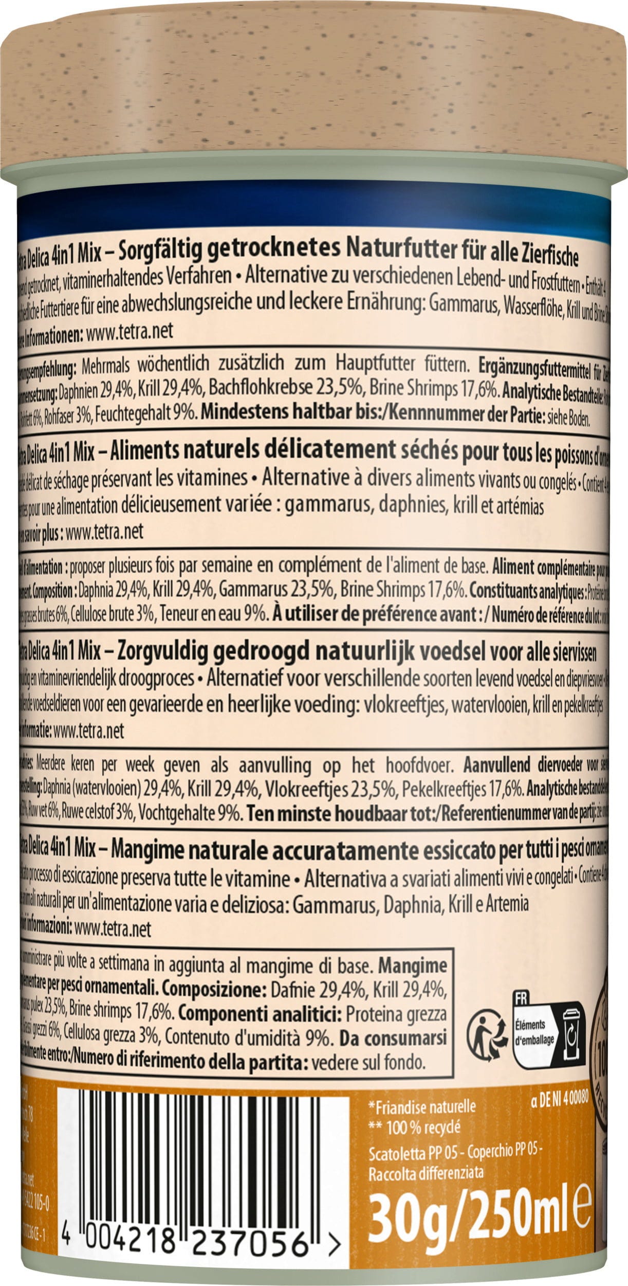 Tetra Delica Mix może być podawana jako dodatek do pokarmu podstawowego 2-3 razy w tygodniu w takiej ilości, którą ryby mogą zjeść w ciągu ok. 5 minut. Przysmak ten powinien być podawany jako odmiana przy TetraMin Flakes pokarm w płatkach / Granules pokarm w granulkach albo TetraPro. Data przydatności do spożycia na opakowaniu pokazuje datę, do której pokarm zamknięty i odpowiednio przechowywany pozostaje niezepsuty. Otworzone opakowanie należy zużyć w ciągu 3 miesięcy, ponieważ wilgoć, powietrze i słońce wpływają negatywnie na ilość substancji odżywczych - w ten sposób wpływają na dostarczanie potrzebnych dla życia składników.