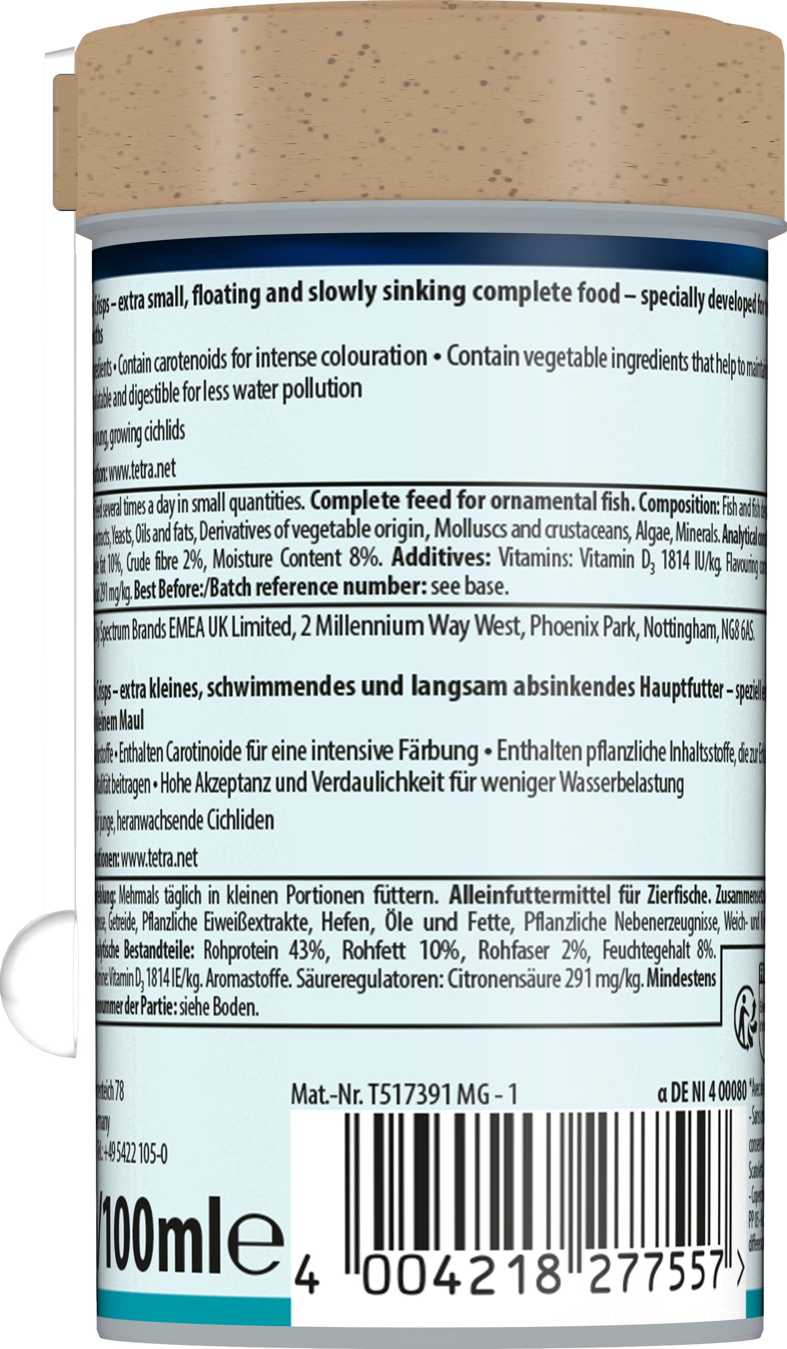 Pokarm Tetra Micro Crisp zawiera wysokiej jakości składniki odżywcze spełniające szczególne wymagania małych ryb ozdobnych i składa się ze zrównoważonego połączenia składników roślinnych i zwierzęcych, dlatego ryby roślinożerne i mięsożerne otrzymują wszystko, czego potrzebują do zbilansowanej diety dostosowanej do ich potrzeb.
