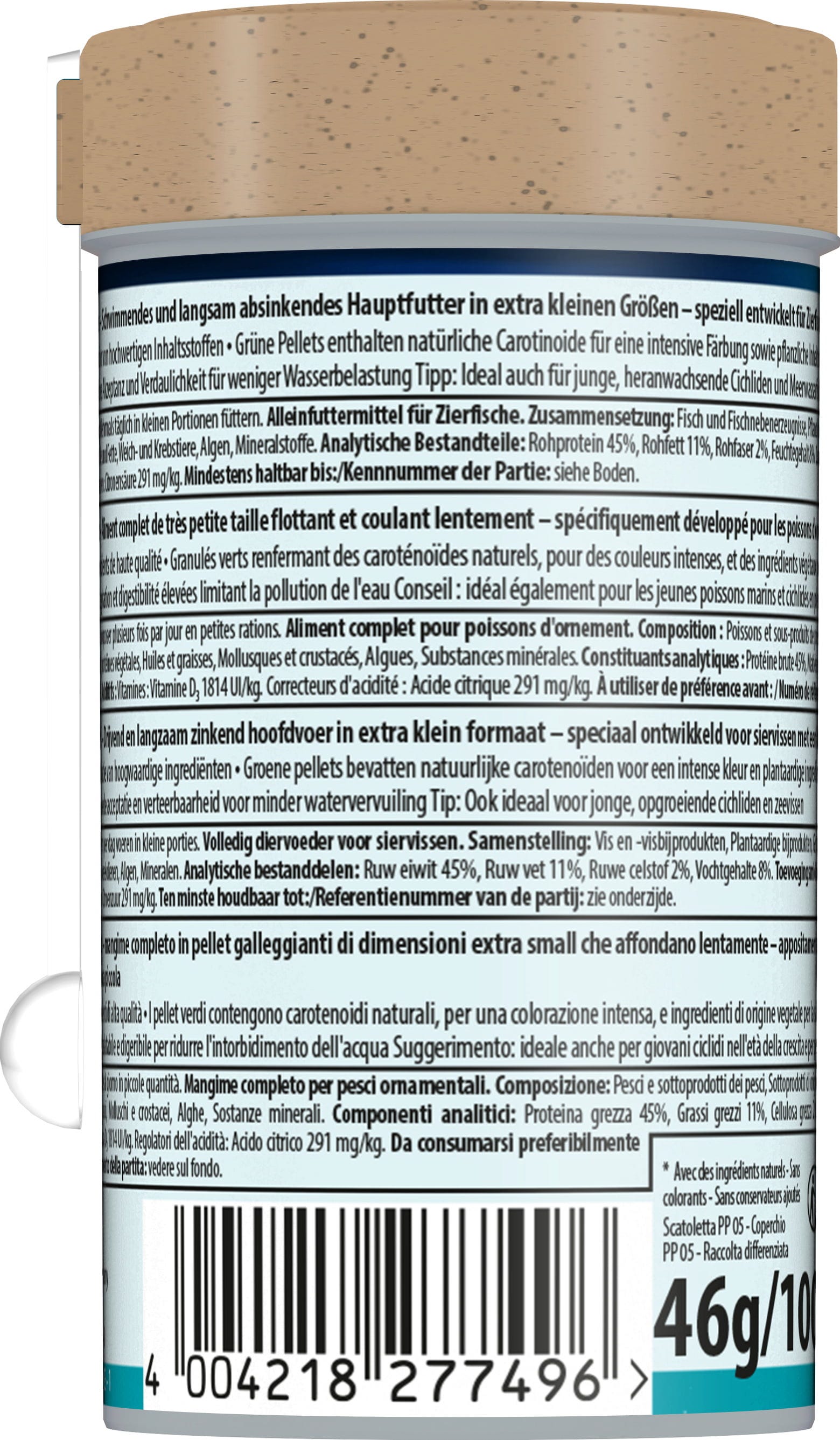 Tetra Micro Pellets zostały stworzone z wysokiej jakości składników odżywczych dla szczególnych wymagań małych ryb ozdobnych i składają się ze zrównoważonego połączenia składników roślinnych i zwierzęcych. Dlatego ryby roślinożerne i mięsożerne otrzymują wszystko, czego potrzebują do zbilansowanej diety dostosowanej do ich potrzeb.