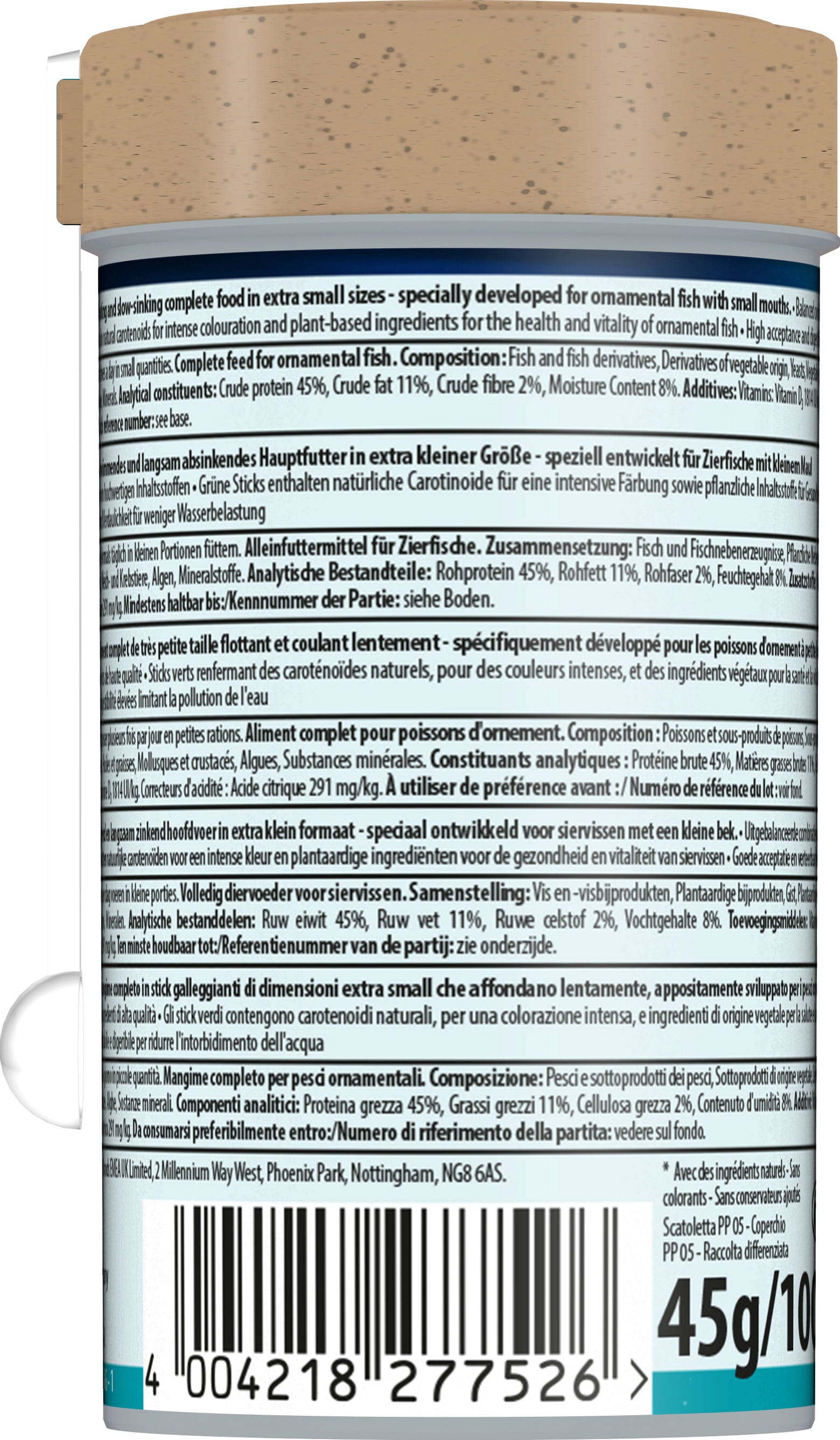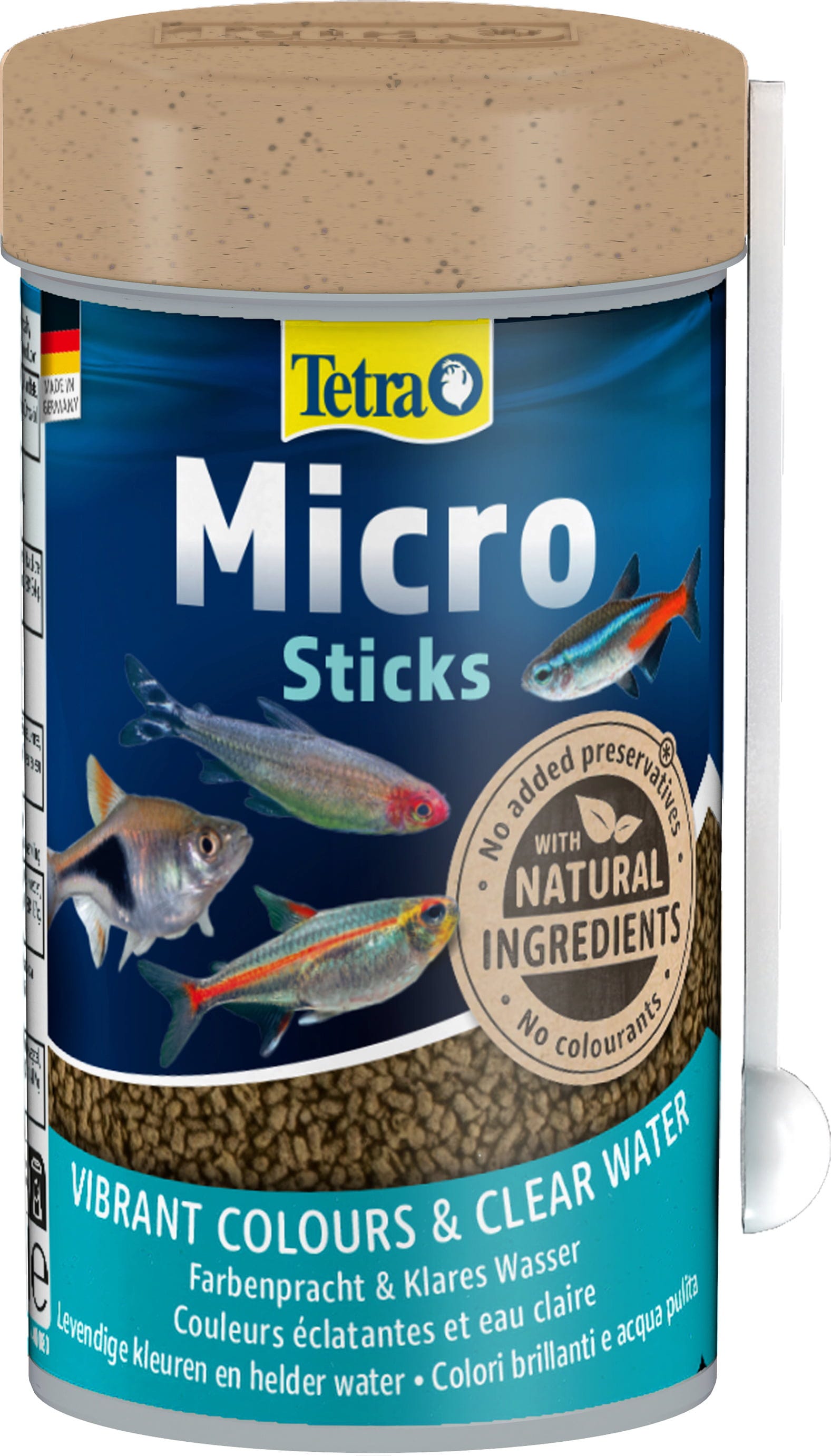 Tetra Micro Sticks zostały opracowane z wysokiej jakości składników odżywczych dla szczególnych wymagań małych ryb ozdobnych i składają się ze zrównoważonego połączenia składników roślinnych i zwierzęcych. Dlatego ryby roślinożerne i mięsożerne otrzymują wszystko, czego potrzebują do zbilansowanej diety dostosowanej do ich potrzeb.