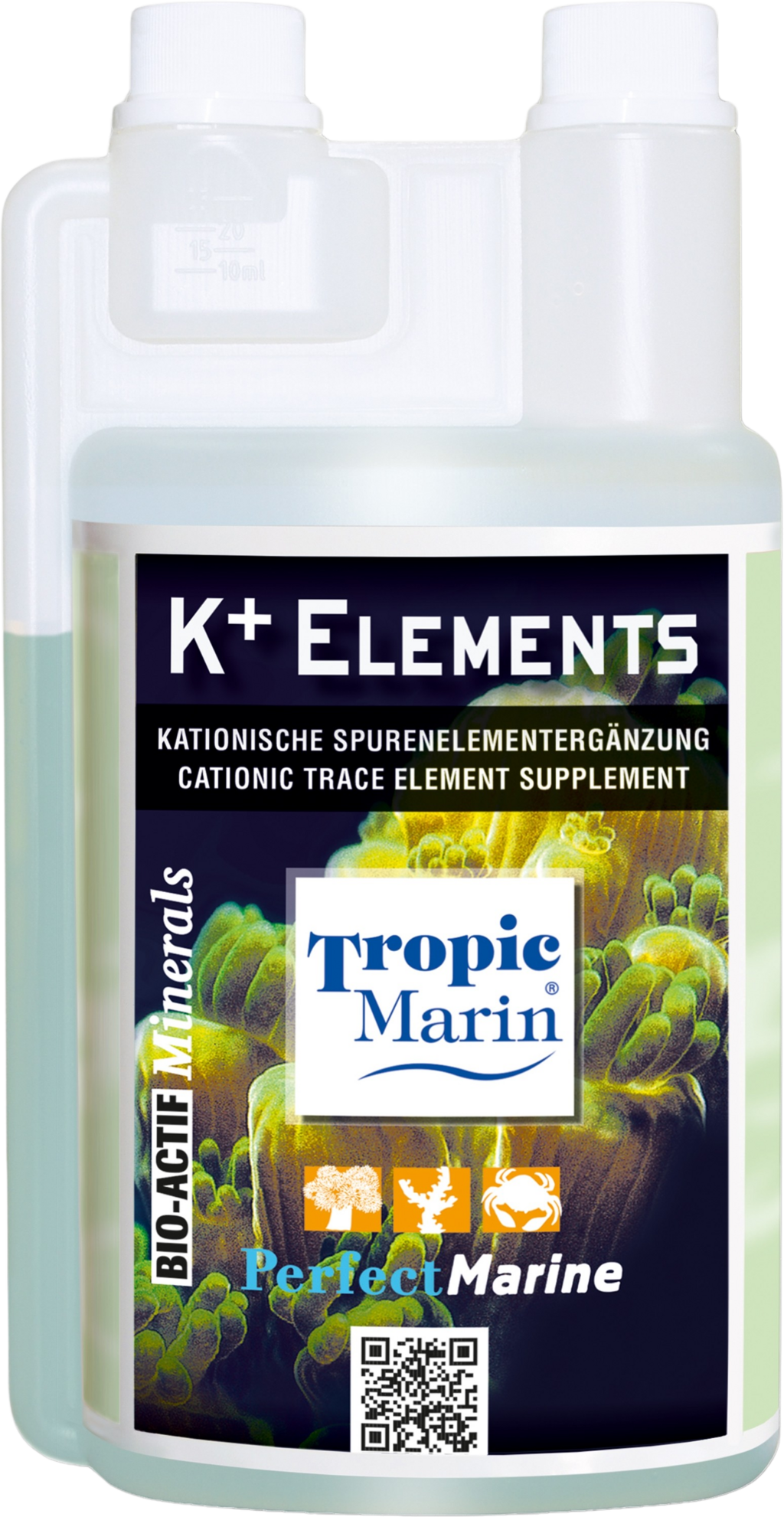 Tropic Marin K+ Elements to kationowy suplement pierwiastków śladowych zawierający bar, bor, chrom, kobalt, żelazo, miedź, mangan, nikiel, stront i cynk w postaci czysto mineralnej. Płynny preparat wspomaga naturalne i biologiczne procesy w akwariach rafowych oraz przyczynia się do witalności koralowców.